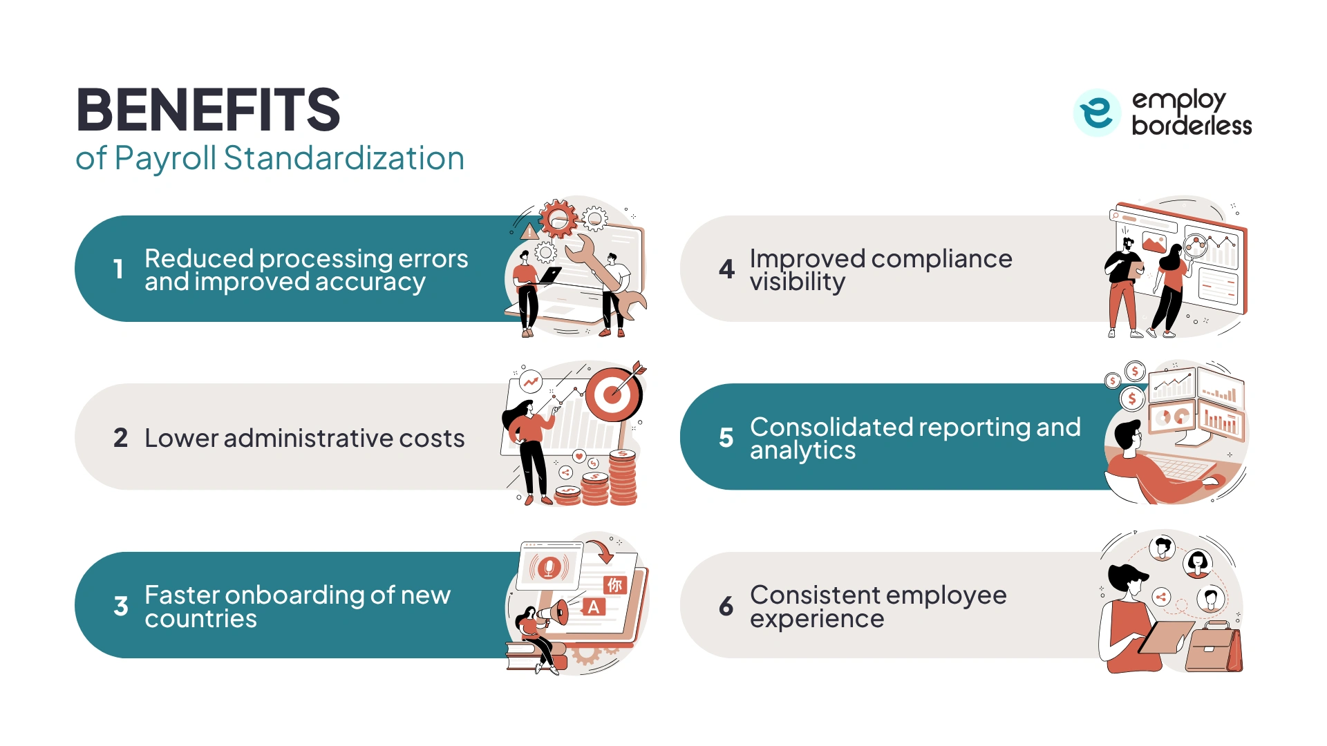 The benefits of payroll standardization include reduced processing errors, lower administrative costs, faster onboarding of new countries, improved compliance visibility, consolidated reporting, and a more consistent employee experience across locations.