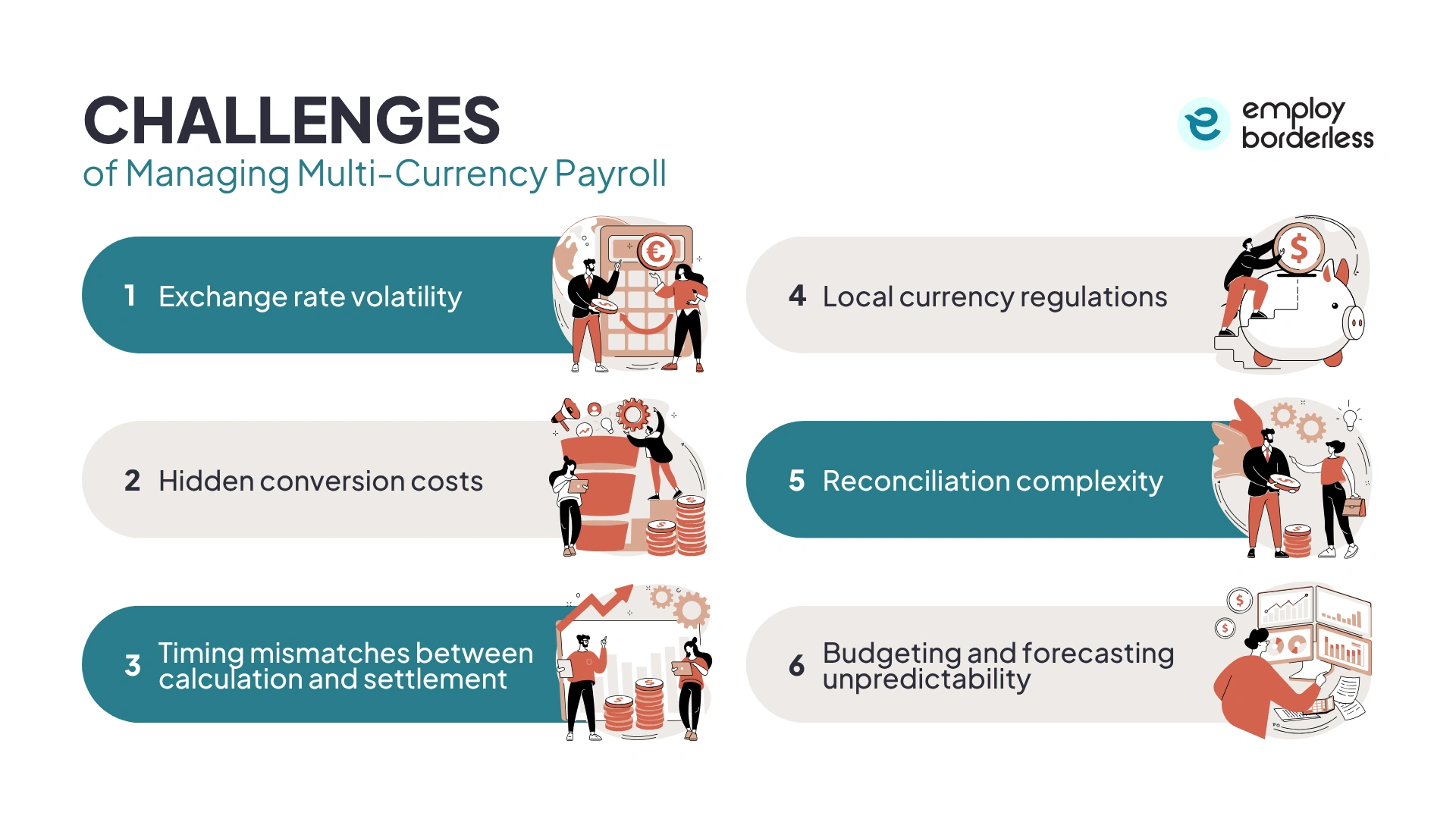 The challenges of managing multi-currency payroll include exchange rate volatility, hidden conversion costs, timing mismatches between calculation and settlement, local currency regulations, reconciliation complexity, and budgeting unpredictability.