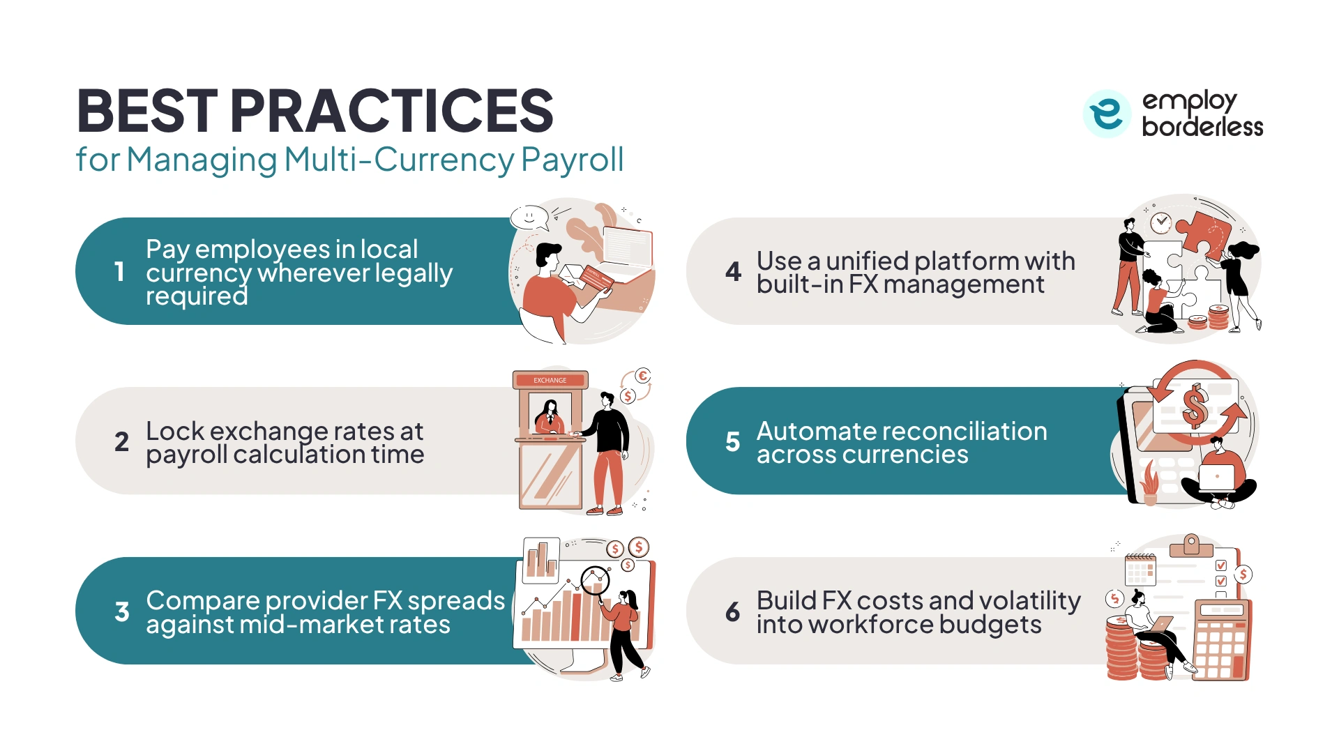 The best practices for managing multi-currency payroll include paying in local currency wherever legally required, locking exchange rates at calculation time, and comparing provider spreads against mid-market rates. Additional best practices include using a unified platform with built-in FX management, automating reconciliation, and building FX costs into workforce budgets.