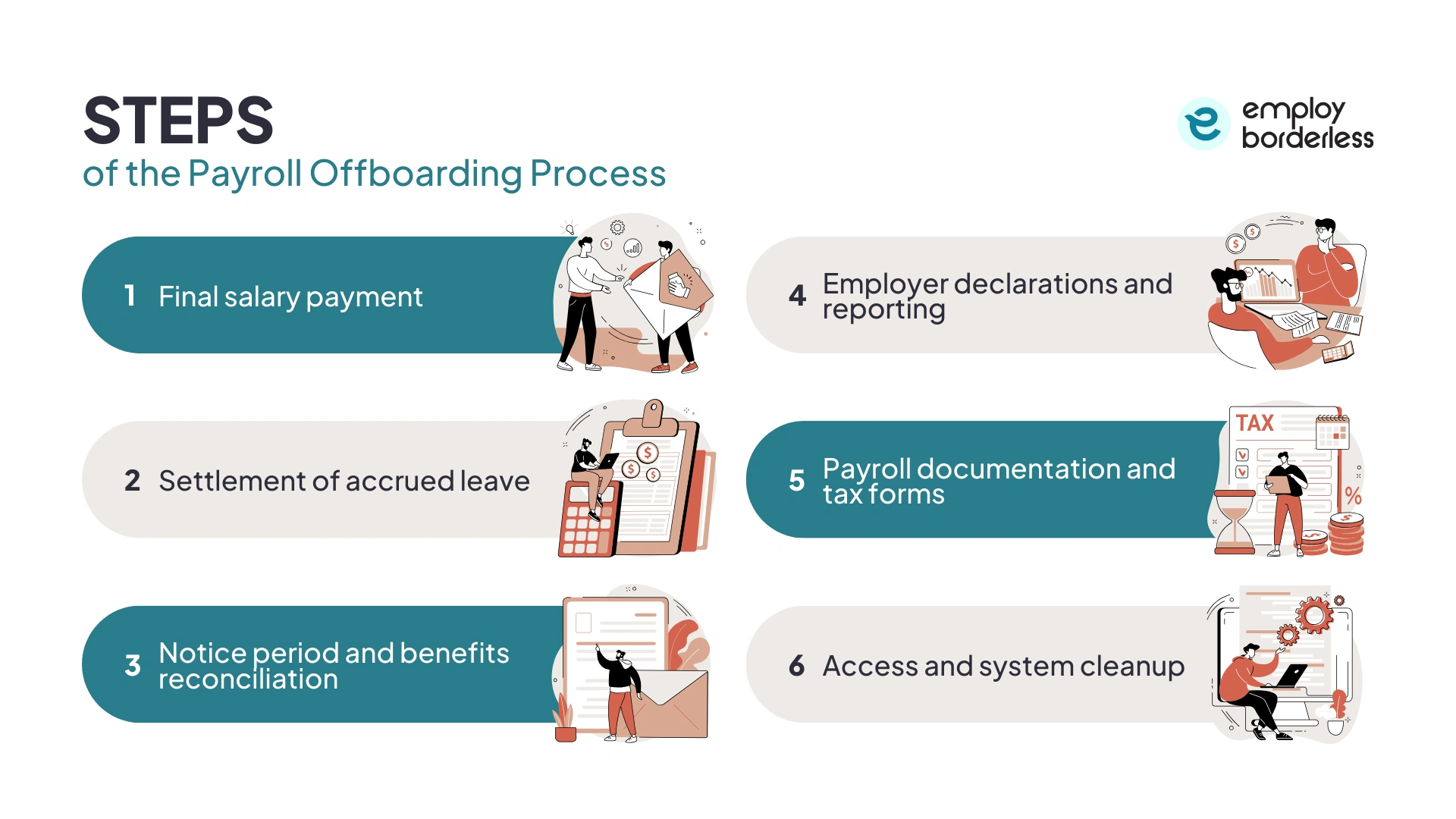 The steps of the payroll offboarding process involve final salary payment, settlement of accrued leave, notice period and benefits reconciliation, employer declarations and reporting, payroll documentation and tax forms, and access and system cleanup. Proper payroll offboarding also provides benefits, like a clear benefits timeline, a smooth transition to continued coverage, accurate retirement guidance, financial risk reduction, and a positive employee experience.