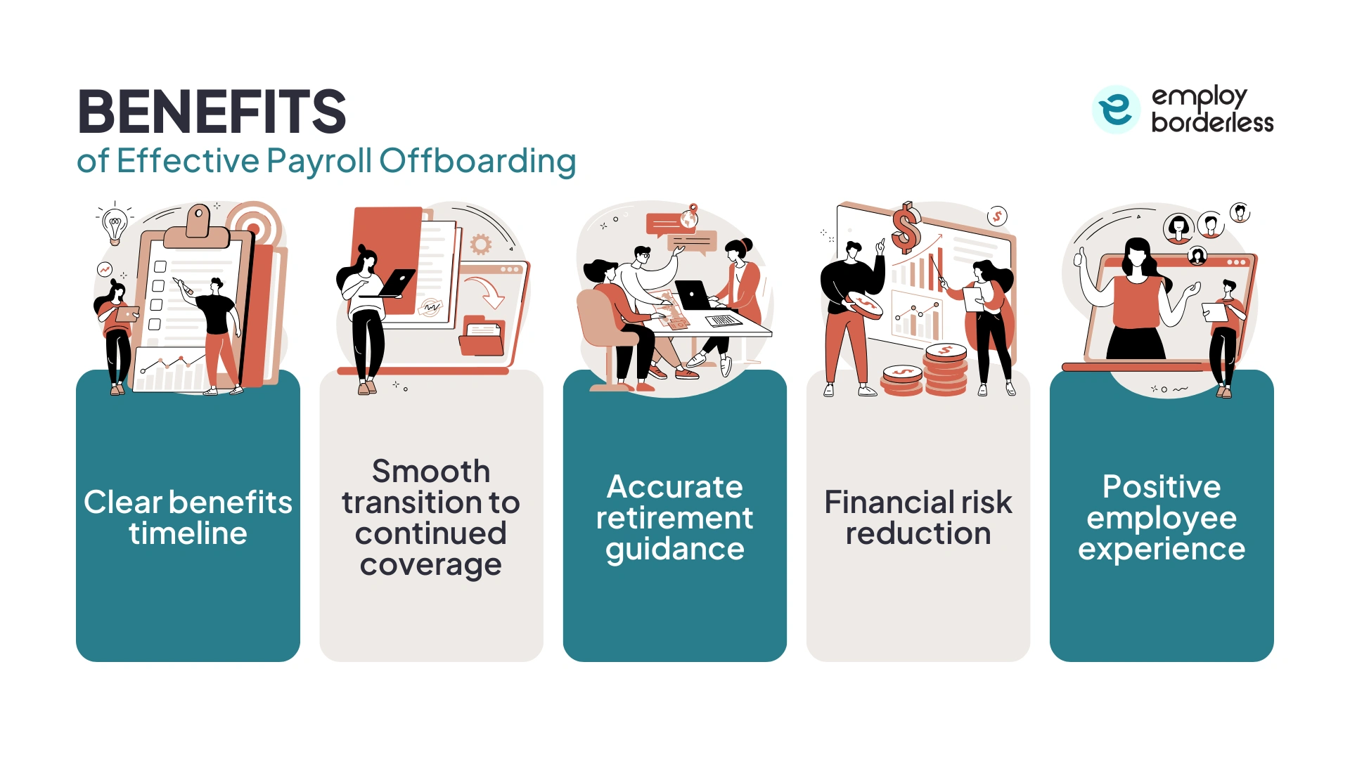 The benefits of effective payroll offboarding include a clear benefits timeline, a smooth transition to continued coverage, accurate retirement guidance, financial risk reduction, and a positive employee experience.