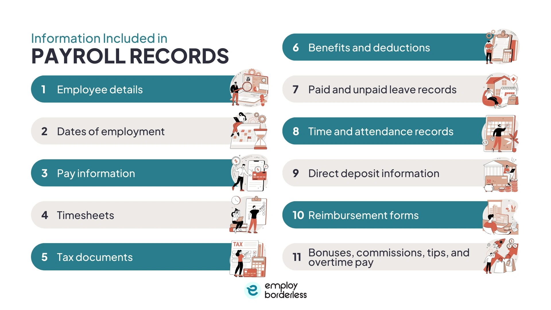 The information included in payroll records is employee details, dates of employment, pay information, timesheets, tax documents, and benefits and deductions. Other important information involves paid and unpaid leave records, time and attendance records, direct deposit information, and reimbursement forms.