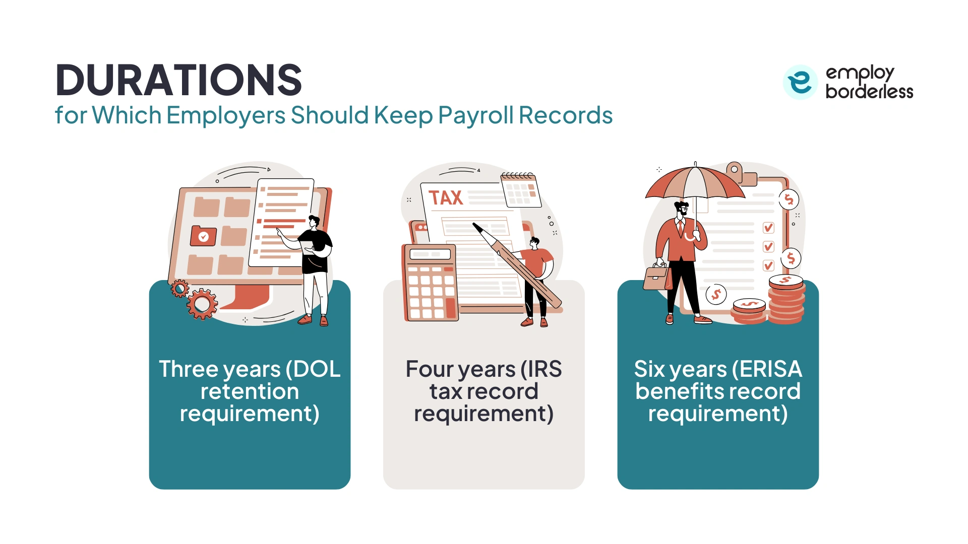 The durations for which employers should keep payroll records are listed below.