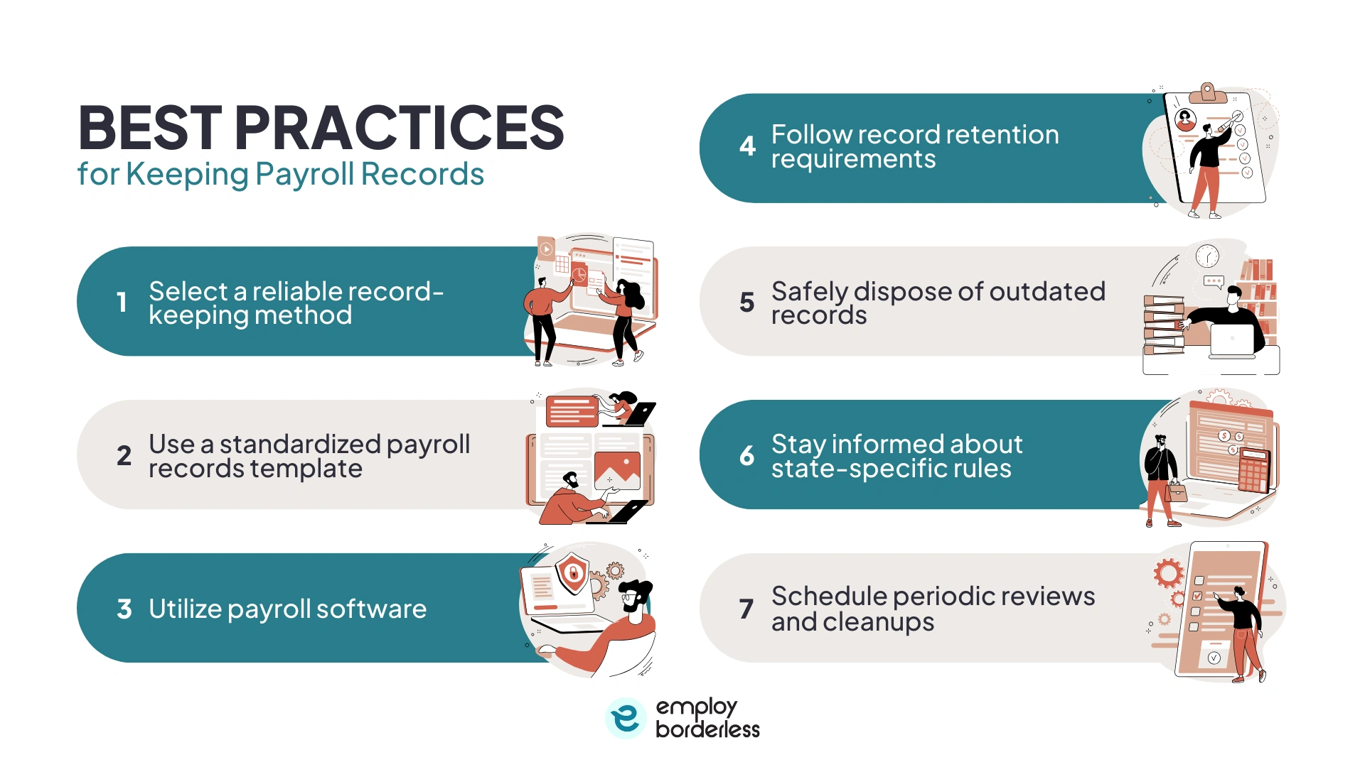 The recommended practices for keeping payroll records include selecting a reliable recordkeeping method, using a standardized payroll records template, using payroll software, and following record retention requirements. Some other recommended practices are safely disposing of outdated records, staying informed about state-specific rules, and scheduling periodic reviews and cleanups.