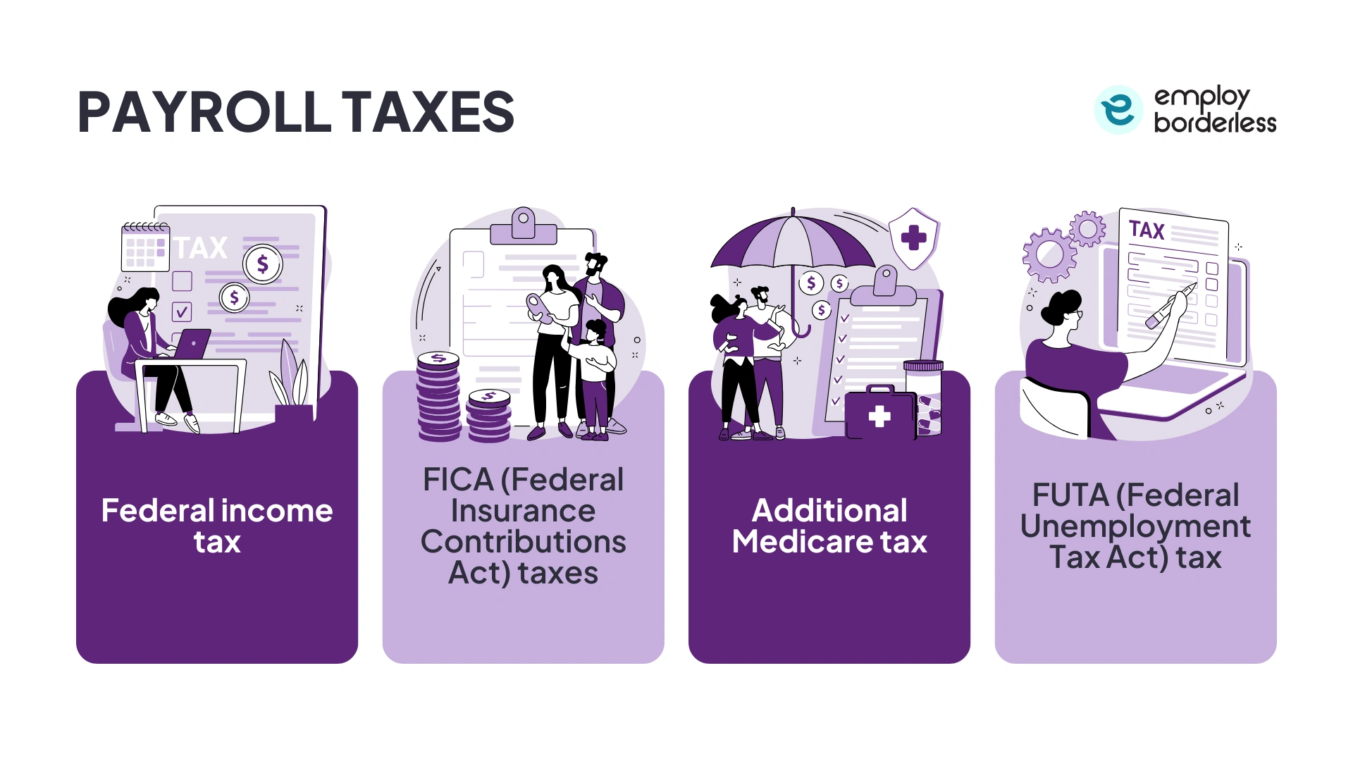 Payroll taxes are taxes that employers and employees pay on wages and salaries to fund government social insurance programs. These taxes are federal income tax, FICA (Federal Insurance Contributions Act) taxes, additional Medicare tax, and FUTA (Federal Unemployment Tax Act) tax.