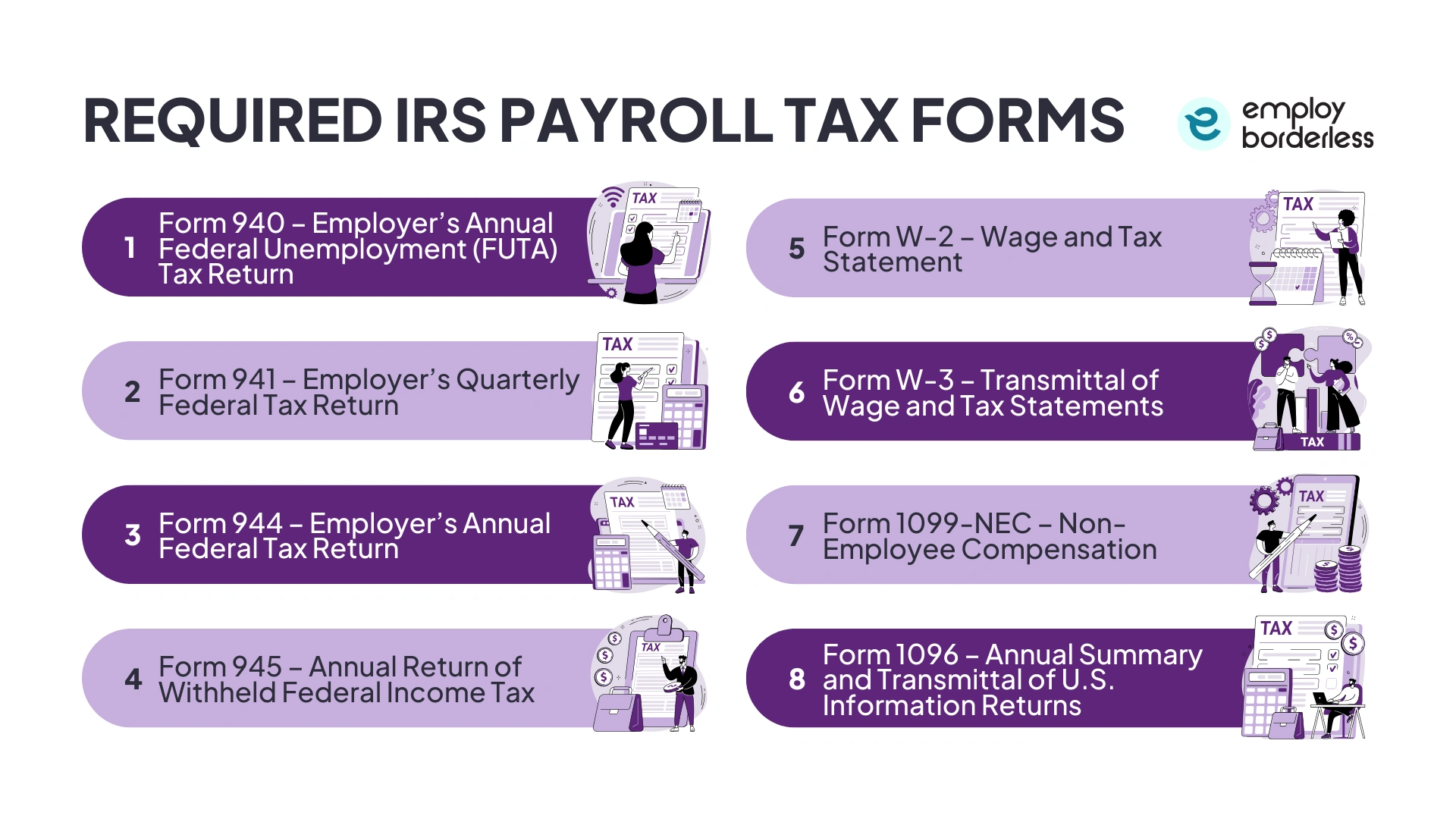 The required IRS payroll tax forms are Form 940 (Employer’s Annual Federal Unemployment (FUTA) Tax Return), Form 941 (Employer’s Quarterly Federal Tax Return), Form 944 (Employer’s Annual Federal Tax Return), and Form 945 (Annual Return of Withheld Federal Income Tax). Other payroll tax forms include Form W-3 (Transmittal of Wage and Tax Statements), Form 1099-NEC (Non-Employee Compensation), and Form 1096 (Annual Summary and Transmittal of U.S. Information Returns).