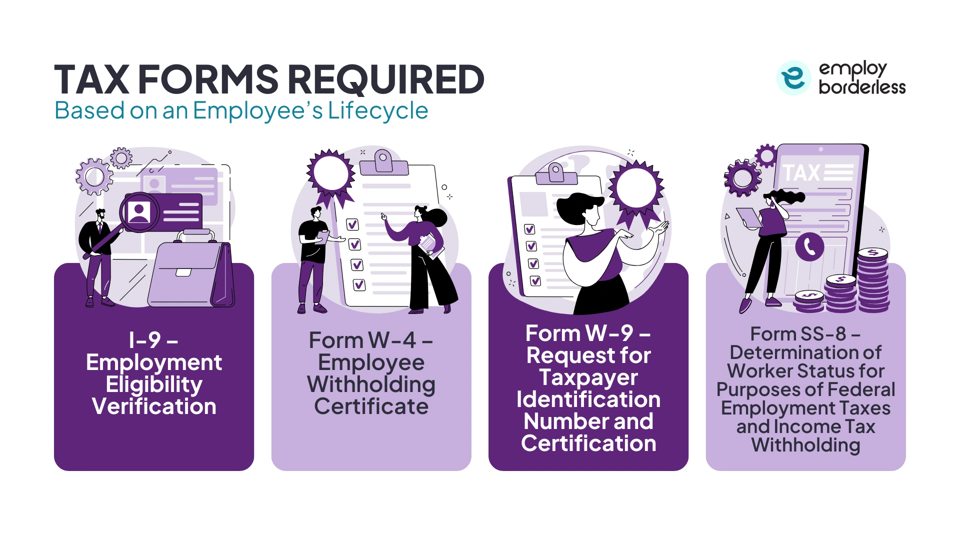 The tax forms required based on an employee’s lifecycle include I-9 (Employment Eligibility Verification), Form W-4 (Employee Withholding Certificate), Form W-9 (Request for Taxpayer Identification Number and Certification), and Form SS-8 (Determination of Worker Status for Purposes of Federal Employment Taxes and Income Tax Withholding).