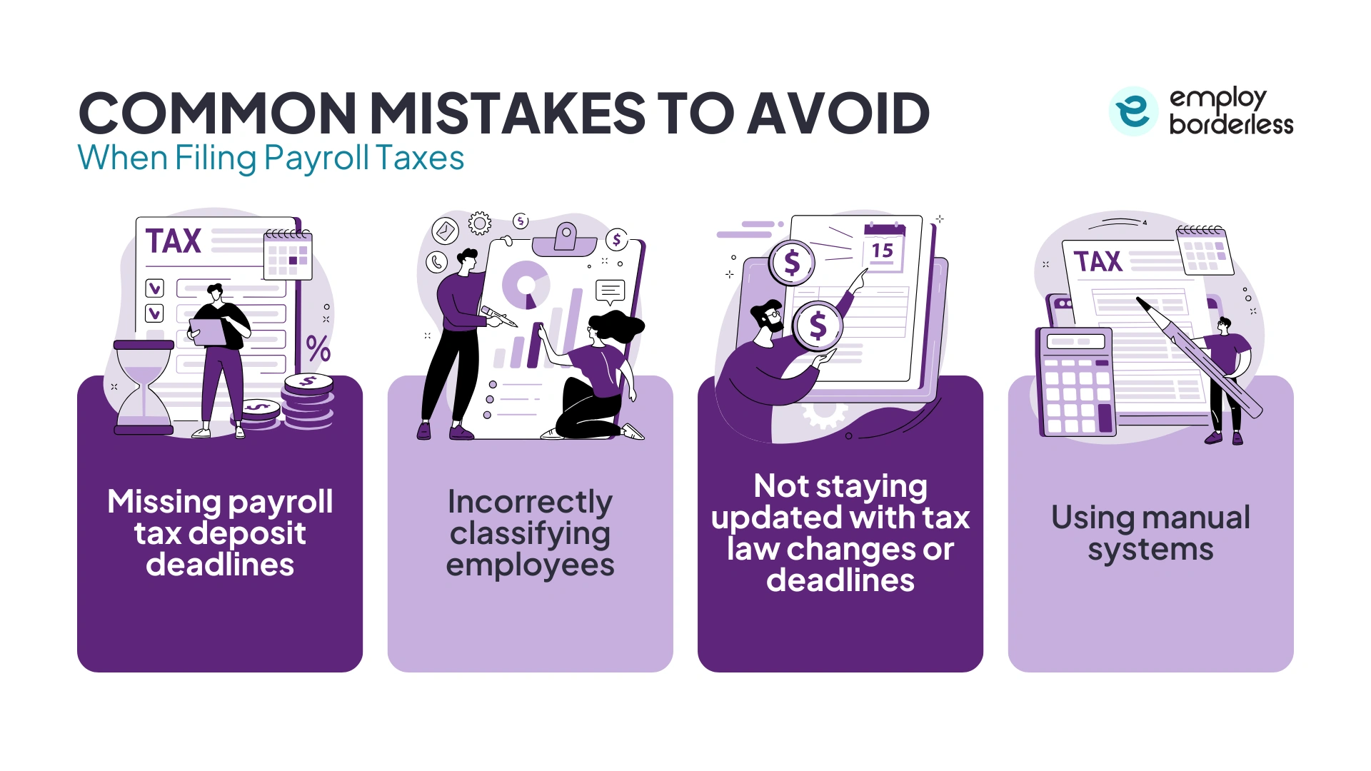 Common mistakes to avoid when filing payroll taxes are missing payroll tax deposit deadlines, incorrectly classifying employees, not staying updated with tax law changes or deadlines, and using manual systems.