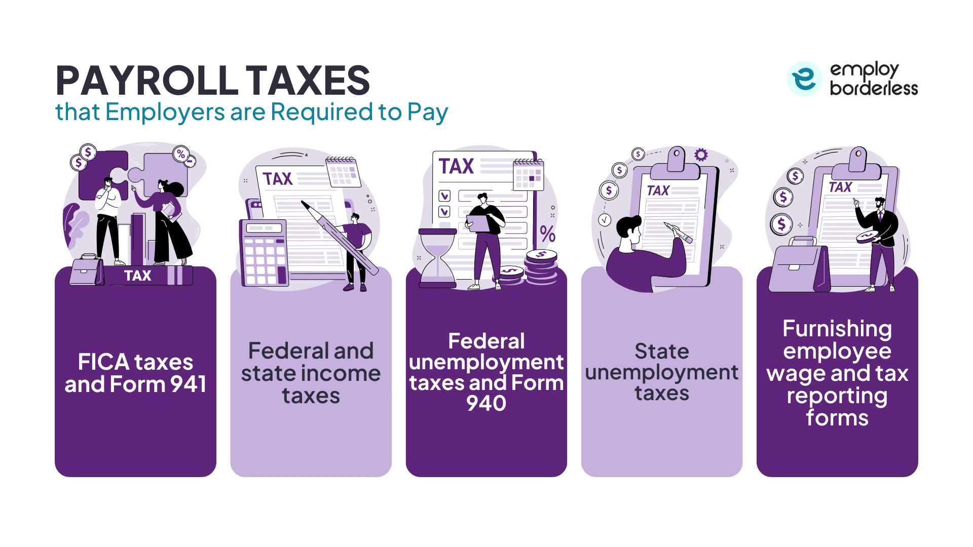 Payroll taxes that employers are required to pay include FICA taxes and Form 941, federal and state income taxes, federal unemployment taxes and Form 940, state unemployment taxes, and furnishing employee wage and tax reporting forms.