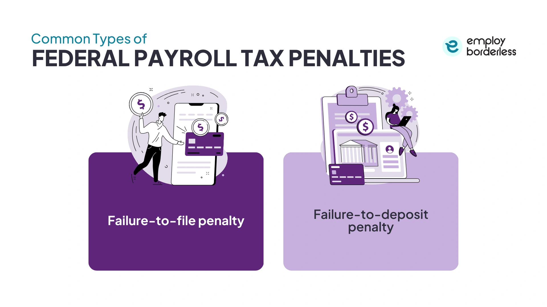 The common types of federal payroll tax penalties are the failure-to-file penalty and the failure-to-deposit penalty.