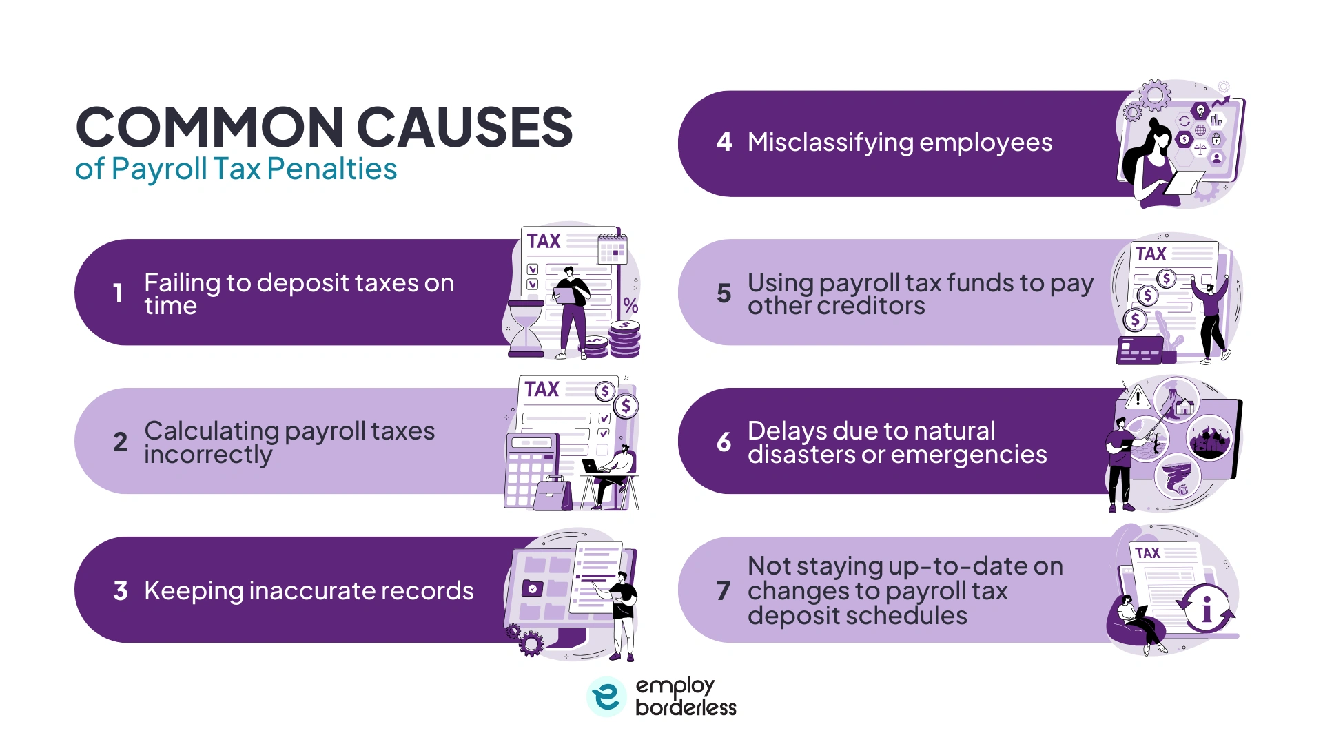 The common causes of payroll tax penalties are failing to deposit taxes on time, calculating payroll taxes incorrectly, keeping inaccurate records, using payroll tax funds to pay other creditors, and not staying up-to-date on changes to payroll tax deposit schedules.