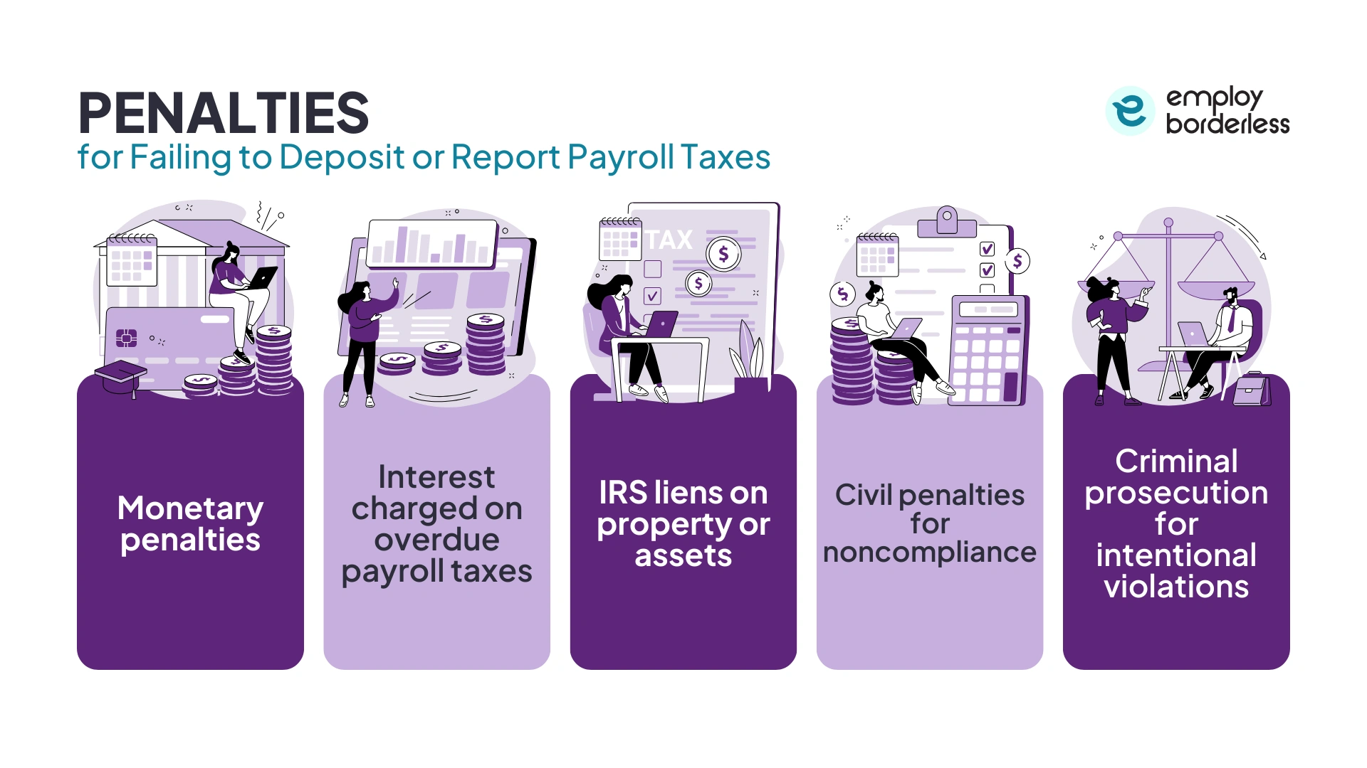 The penalties for failing to deposit or report payroll taxes are monetary penalties, interest charged on overdue payroll taxes, IRS liens on property or assets, civil penalties for noncompliance, and criminal prosecution for intentional violations.