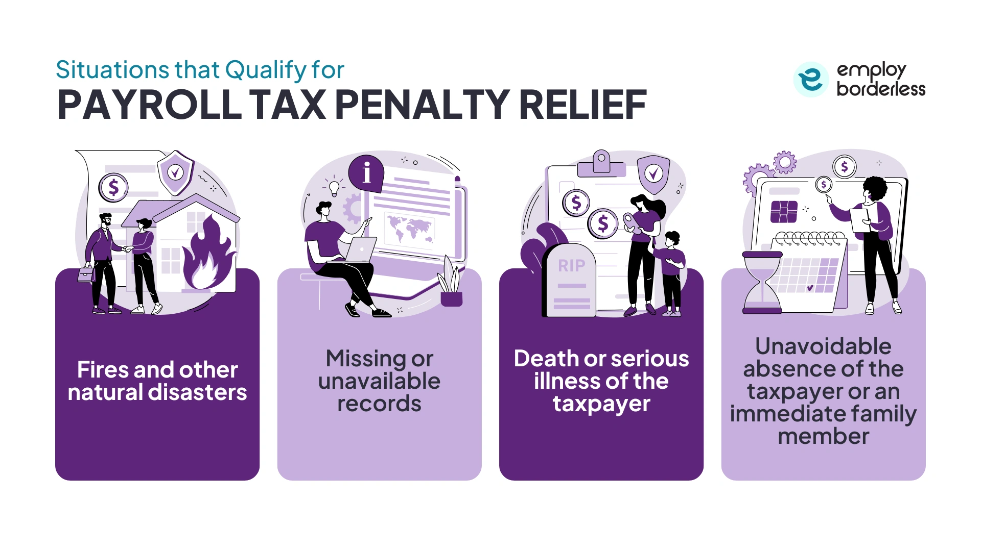 The situations that qualify for payroll tax penalty relief are discussed below.